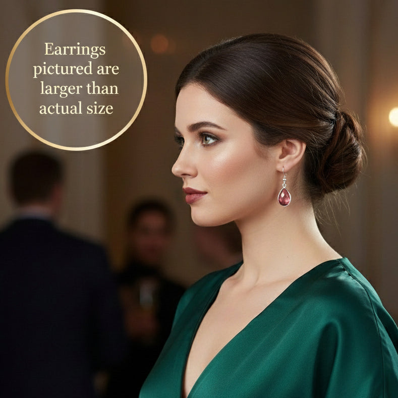 Elegant teardrop earrings featuring luminous pink sapphire crystals suspended from polished silver-plated earwires. Each piece measures 1" in length, striking a refined balance between statement and wearability. The soft pink tones and crystalline sparkle complement both everyday elegance and special occasions. Perfect for adding a touch of sophisticated color to any jewelry collection.