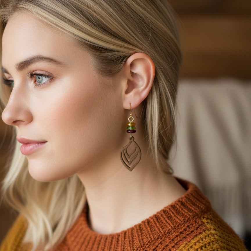 Earrings | Wooden Leaf Charms | Multi-colored Czech Glass Saucer Beads | 2.5"