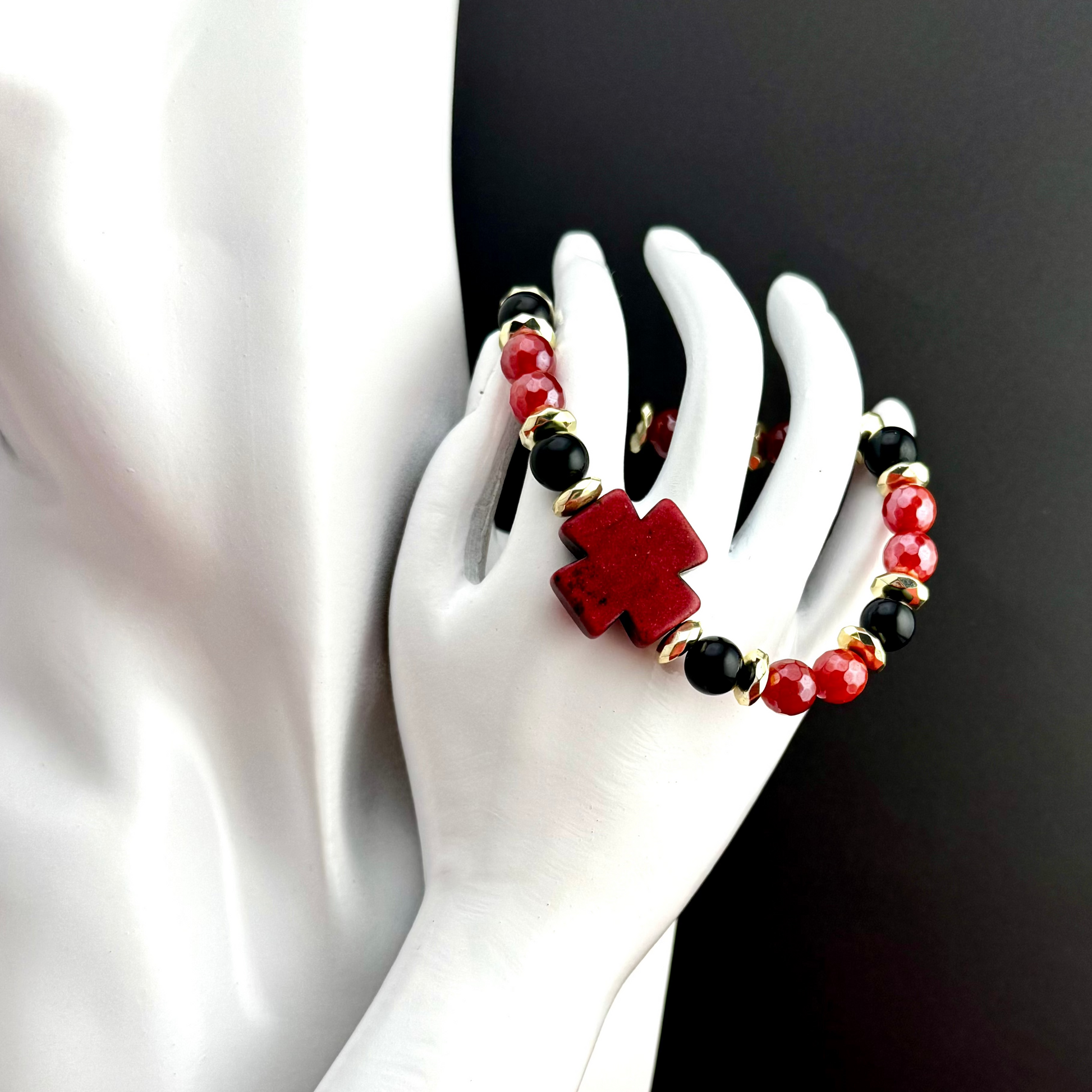 Expertly crafted with genuine Red Agate, Dyed Cross, Round Onyx, and Gold-plated Spacer Beads, this necklace boasts a unique and sophisticated design. The combination of these high-quality materials provides durability and timeless elegance, making it a perfect addition to any jewelry collection.
